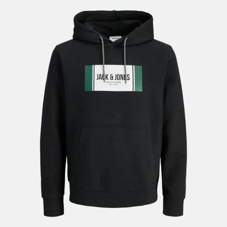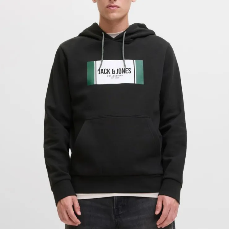 - Graphique central de forme rectangulaire avec l’inscription **JACK & JONES** centré. Blocs de couleur vert sapin et blanc. Petite étiquette de marque à l’intérieur du col.