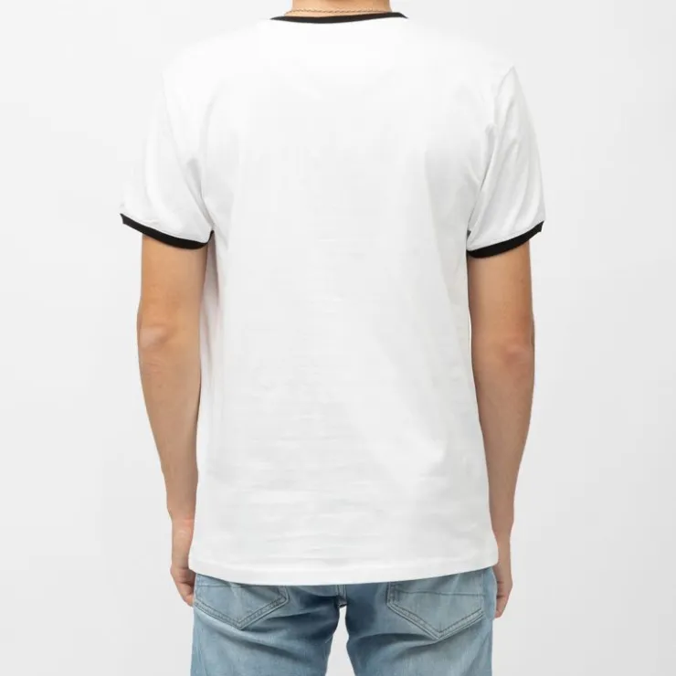 - Couleur principale : Blanc uni avec finitions contrastantes noires sur l’encolure et les manches.