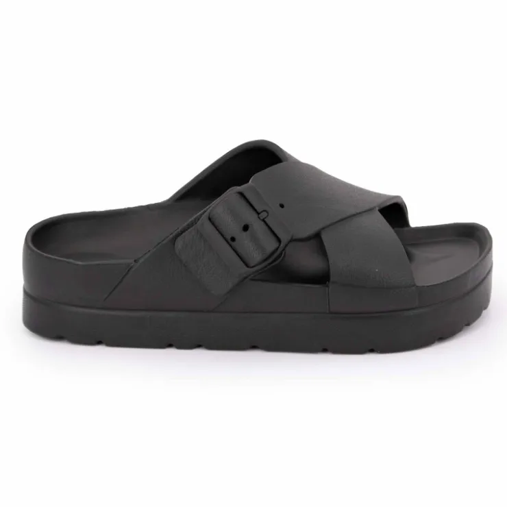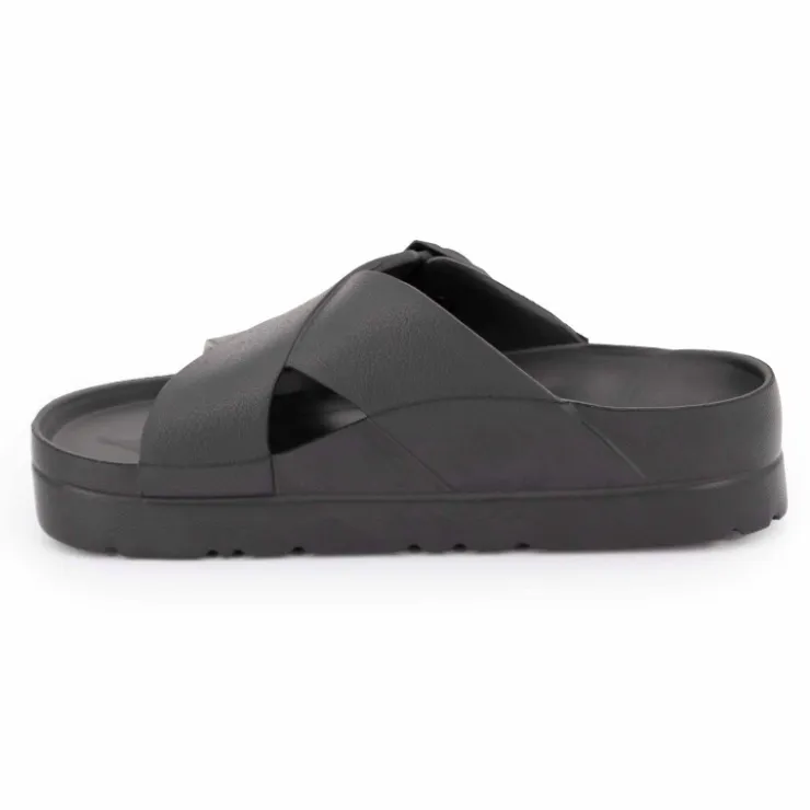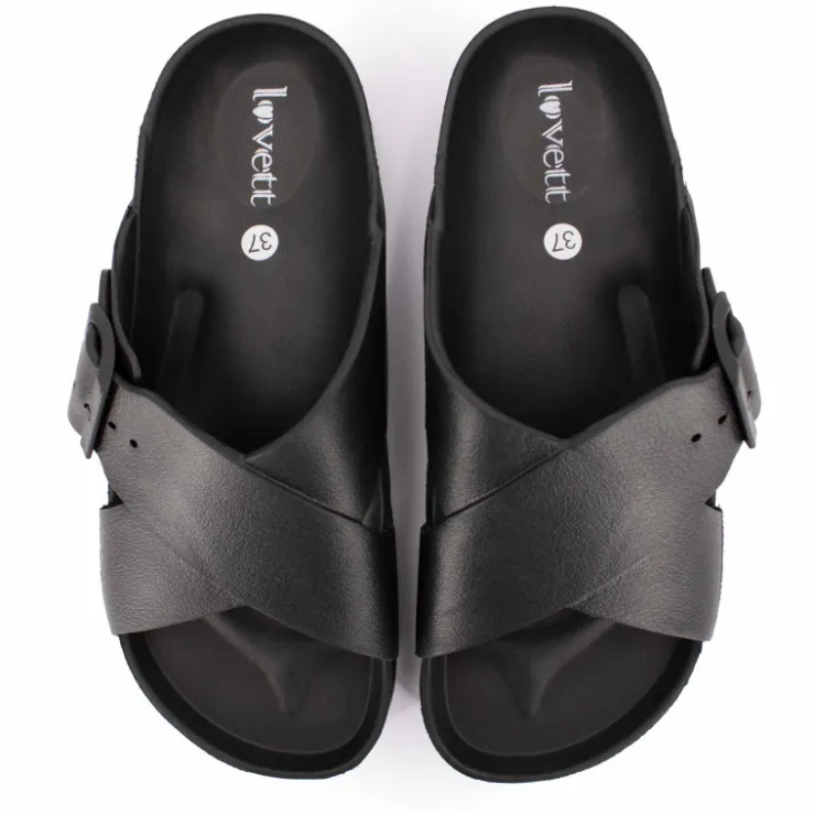vous propose cette paire de Mules semelle épaisse crantée et double bride croisée pour femme de la marque LOVETT à prix dégriffé.